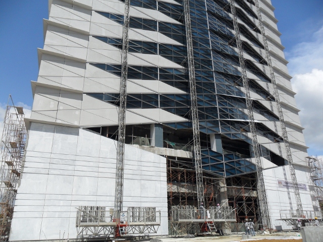 Aluminum Clading 4G10 Putrajaya with using a Twin Mast confurgation of Mast Climbing Work Platform.